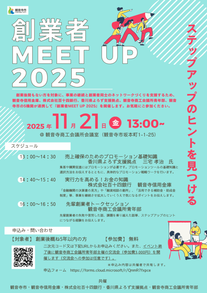 創業後間もない方を対象に、事業の継続と創業者同士のネットワークづくりを支援するため、観音寺信用金庫、株式会社百十四銀行、香川県よろず支援拠点、観音寺商工会議所青年部、観音寺市の5機関が連携して『 創業者 MEET UP 2025』を開催します。お気軽にご参加ください。