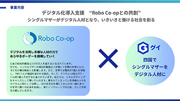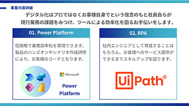 デジタル化はプロではなくお客様自身によるものという信念のもと、社員誰もが業務の課題を見つけてDXを実現できるよう、ローコード・ツールによる効率化のお手伝いをします。またシングルマザーへのエンジニア育成と就業を支援しています。