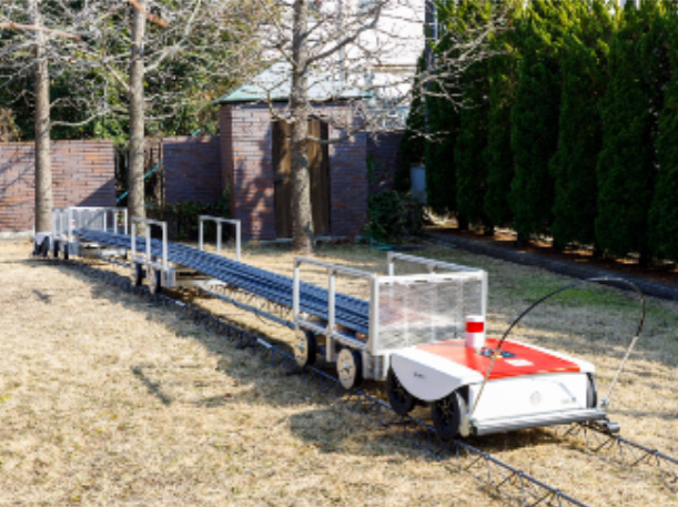 軽量・小型で不整地を走行し最大500kgの資材を搬送可能な運搬作業をサポートする牽引ロボットです。